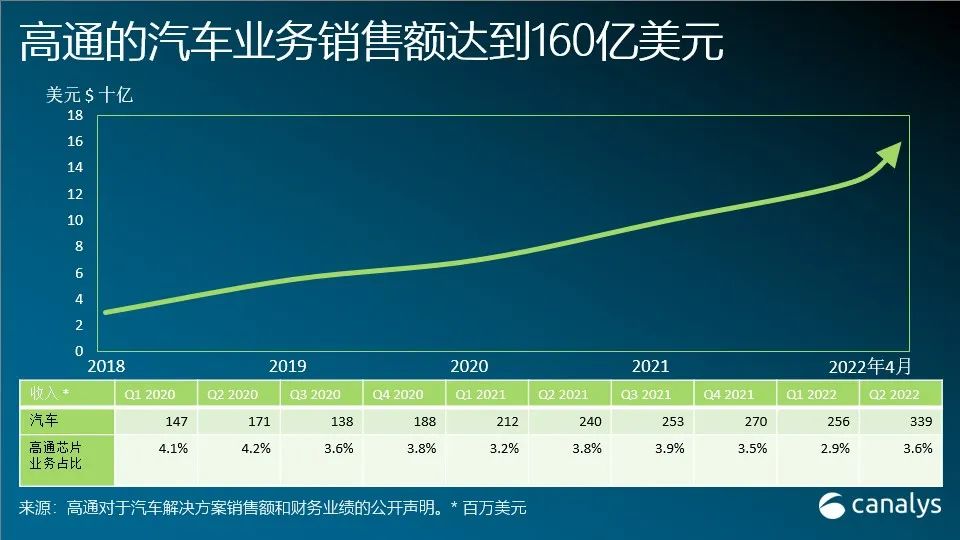 高通的战略合作伙伴包括25家以上轿车OEM厂商、许多一级供货商和解决方案供给商。不过,近年各方面的效果,包括多年的技能合作,均使高通处于更有利的位置。Cristiano Amon在其2022年CES的主题讲演中表明,高通正在运用其在智能手机范畴内一向选用且大获成功的办法——这对轿车范畴的现有供货商来说可不是一个好音讯。在其最新的财政成绩陈述中,高通宣告其轿车解决方案的出售额为160亿美元。相比之下,2019年这一部分出售额为55亿美元,2018年则为30亿美元。2022财年第二季度,其轿车芯片产品收入初次超越3亿美元,但仍占不到高通芯片事务收入的4%。
