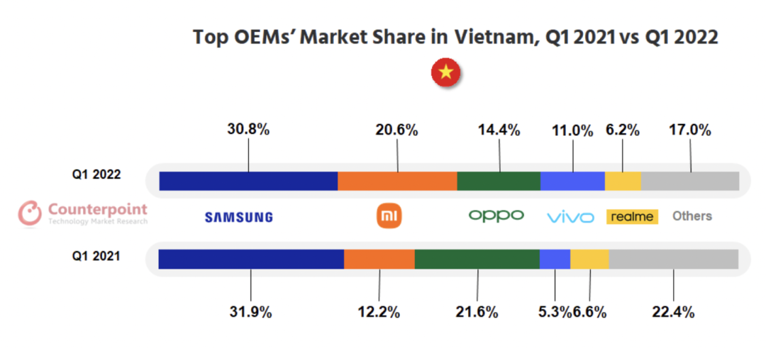 三星在 2022 年第一季度以 30.8% 的商场比例坚持领先地位,这得益于其 Galaxy A 系列和 Galaxy S22 系列的成功,尤其是 Galaxy S22 Ultra 的遍及。越南顾客更喜爱于高端智能手机,Galaxy S22 Ultra 和Apple iPhone 13 Pro Max 是高端产品中热销的机型。小米以 20.6% 的比例位居第二。它的成功是由红米 9 系列和最近推出的红米 Note 11 系列推进的。OPPO和vivo别离以14.4%和11%的比例位居第三第四。