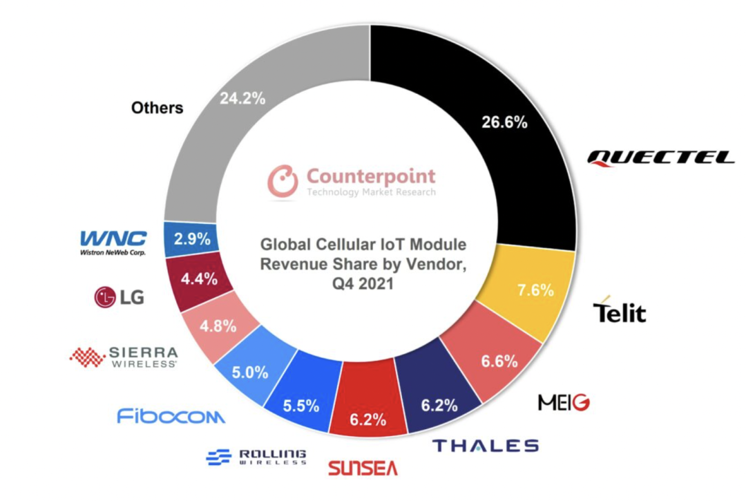 全球蜂窝物联网模组各供给商收入比例,2021年Q4