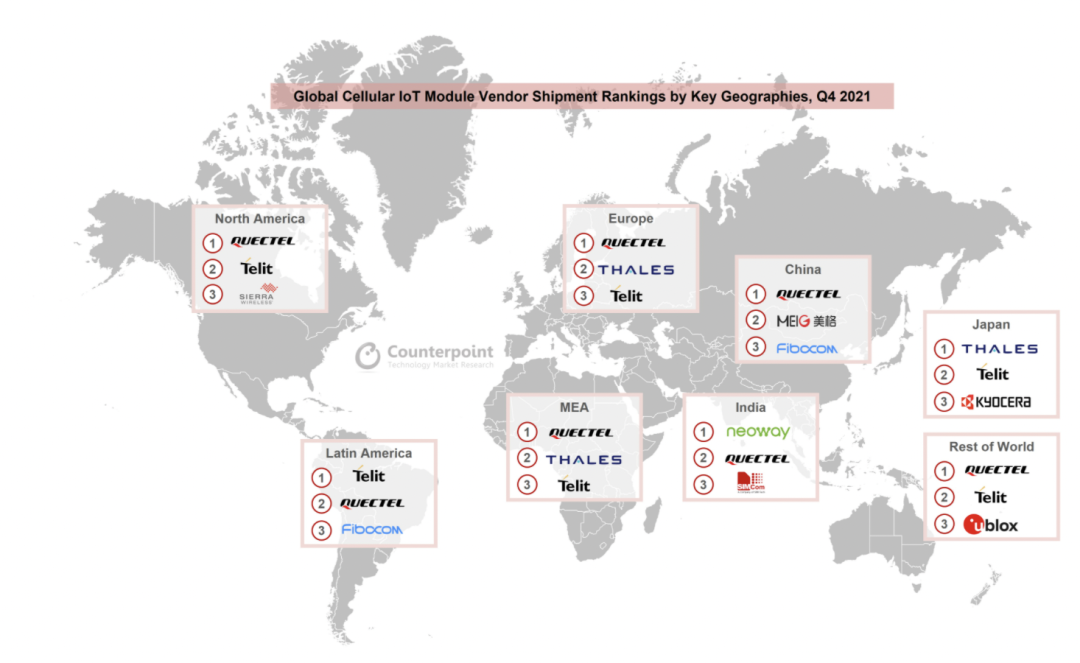 2021年Q4全球蜂窝物联网模组供给商各首要区域出货比例排名