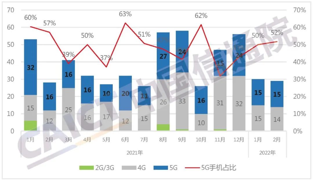 2022年1-2月,上市新机型累计59款,同比下降27.2%,其间5G手机30款,同比下降37.5%,占同期手机上市新机型数量的50.8%。