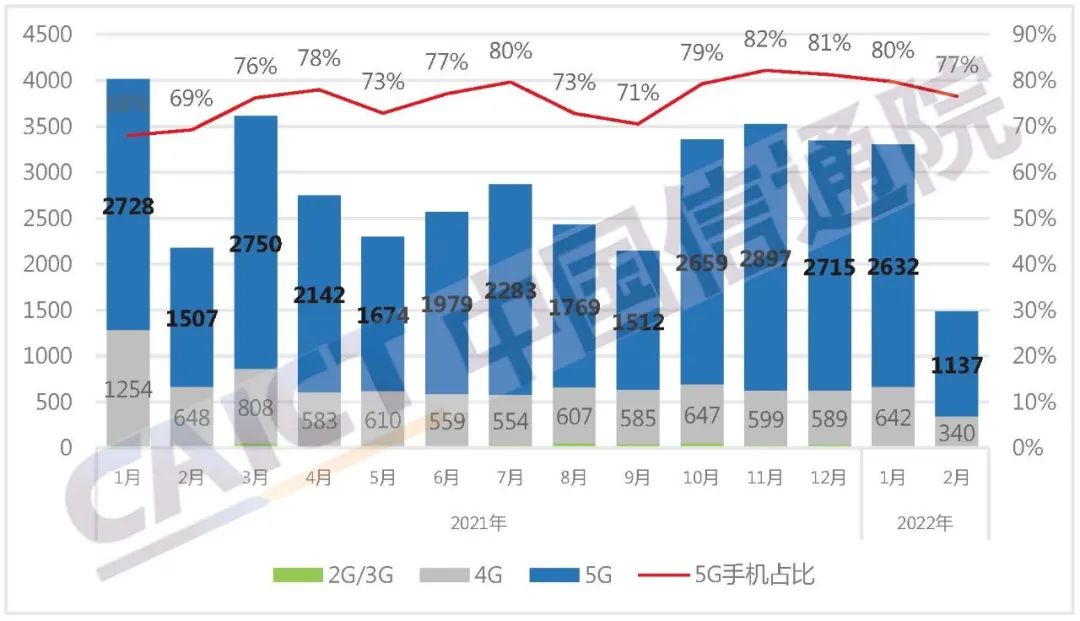 2022年2月,国内商场手机出货量1486.4万部,同比下降31.7%,其间,5G手机1137.4万部,同比下降24.5%,占同期手机出货量的76.5%。