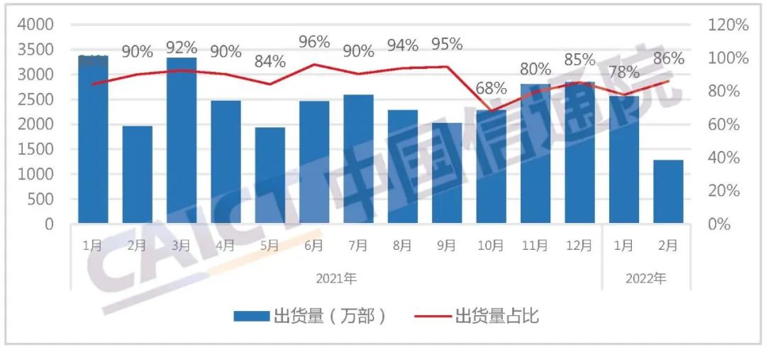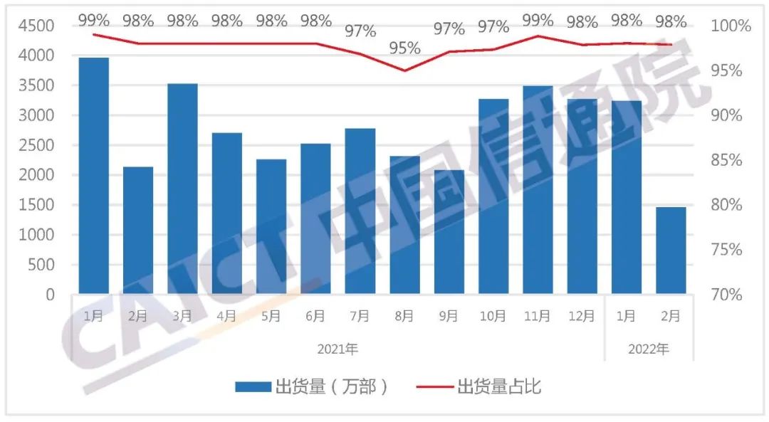 2022年2月,智能手机出货量1454.9万部,同比下降31.8%,占同期手机出货量的97.9%。2022年1-2月,智能手机出货量4691.5万部,同比下降23.0%,占同期手机出货量的98.0%。