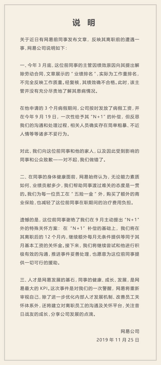 报导,针对有职工发文责备网易暴力裁人一事,网易发表声明称,“本年 3 月底,这位前搭档的主管因绩效原因向其提出免除劳动合同,文章展现的“成绩排名”,实践为作业量排名,不完全反映作业质量。经复核,其绩效确不合格。此刻,该主管并没有充沛尽责地了解其患病状况。”声明中,网易向这位前搭档和家人致歉:“通过反思咱们的交流和处理进程,相关人员的确存在简略粗犷、冷若冰霜等等许多不当行为。对此,咱们向这位前搭档和他的家人,以及因而受到影响的搭档和大众致歉——对不住,咱们做错了。”