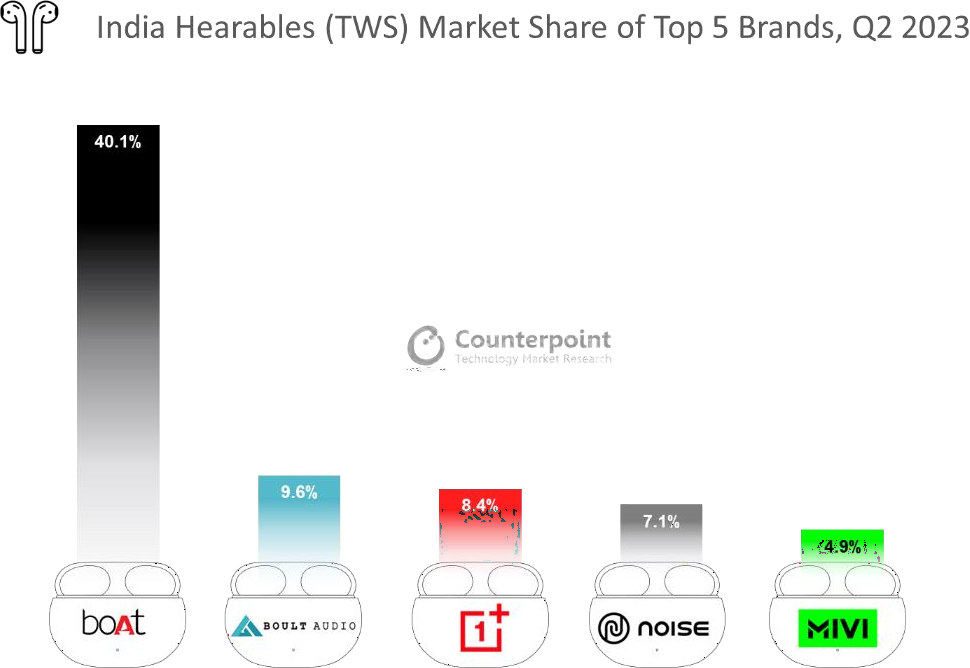 - boAt于2023年第二季度同比增加17%,接连12个季度坚持抢先,而Boult Audio则接连第三个季度位居这以后;
