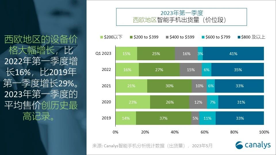 Bjørhovde指出:“最近的经济体现,让运营商途径得以从疫情的低迷中复苏,现在该途径比例略高于50%。这一复苏背面的推进力包含:更具吸引力的分期付款选项,以及面向越来越重视中高端设备的方针群体推出针对性的绑缚优惠。与此一起,西欧区域的设备价格大幅攀升, 2023年第一季度的均匀价格创前史新高,较2022 年第一季度上涨16%,较2019年第一季度上涨29%。”