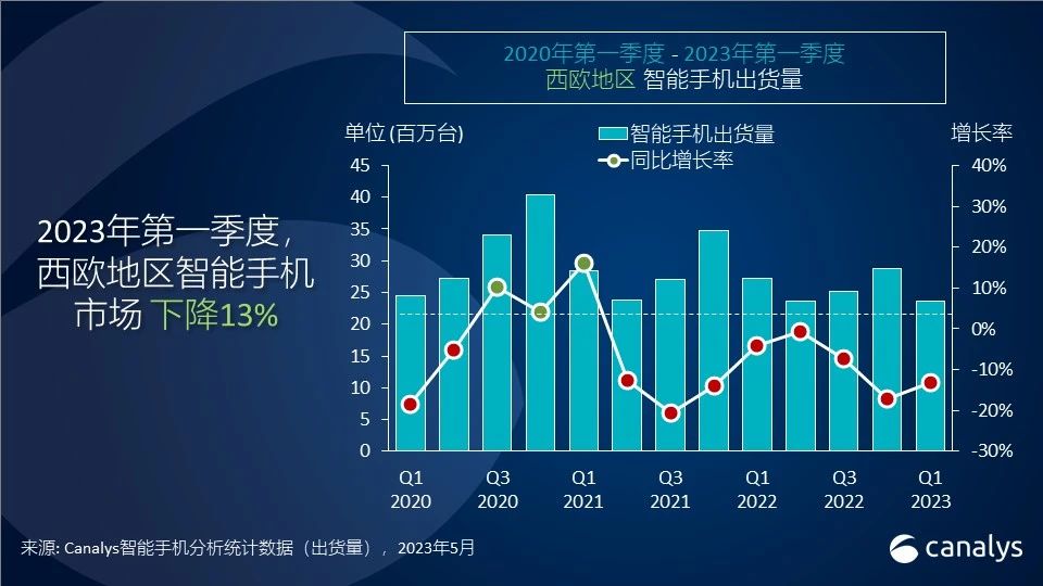 依据Canalys发布的最新数据,2023年第一季度,因为经济局势寸步难行,导致顾客需求下降,购买周期延伸,西欧区域智能手机商场继续坚持低迷,出货量削减13%至 2370万部。但该商场有或许在下一年迎来复苏的曙光,Canalys最新猜测,西欧商场 2024 年或许完成6%的增加。